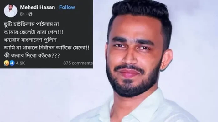 আসন্ন নির্বাচনকে কেন্দ্র করে ছুটি না পাওয়ার অভিযোগ তুলে সামাজিক যোগাযোগমাধ্যমে হৃদয়বিদারক স্ট্যাটাস দিয়েছেন বাংলাদেশ পুলিশের সদস্য মেহেদি হাসান। তিনি জানান, ছেলের মৃত্যুর মতো চরম ব্যক্তিগত বিপর্যয়ের মধ্যেও দায়িত্ব পালনের অজুহাতে তাকে ছুটি দেওয়া হয়নি।