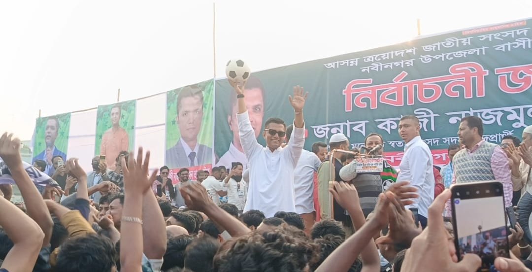 রোববার বিকেলে নবীনগর সরকারি হাইস্কুল মাঠে ‘ফুটবল’ প্রতীক নিয়ে আয়োজিত এক বিশাল নির্বাচনী জনসভায় প্রধান অতিথির বক্তব্যে তিনি এসব কথা বলেন।