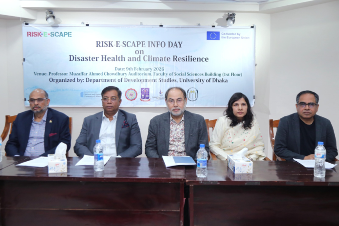 ঢাকা বিশ্ববিদ্যালয়ের উন্নয়ন অধ্যয়ন বিভাগ ‘রিস্ক-ই-স্কেইপ’ শীর্ষক প্রকল্পের আওতায় আজ ৯ ফেব্রুয়ারি ২০২৬ সোমবার দুর্যোগ স্বাস্থ্য ও জলবায়ু স্থিতিস্থাপকতা বিষয়ক এক দিনব্যাপী কর্মসূচির আয়োজন করে। সামাজিক বিজ্ঞান অনুষদ ভবনে অনুষ্ঠিত এই কর্মসূচির লক্ষ্য ছিল শিক্ষা প্রতিষ্ঠান, নীতিনির্ধারক, অনুশীলনকারী, জরুরি প্রতিক্রিয়া কর্মী, শিক্ষার্থী ও সম্প্রদায়ের সদস্যদের মধ্যে দুর্যোগ ঝুঁকি, স্বাস্থ্যগত প্রভাব এবং জলবায়ু স্থিতিস্থাপকতা বিষয়ে সচেতনতা ও প্রস্তুতি জোরদার করা।