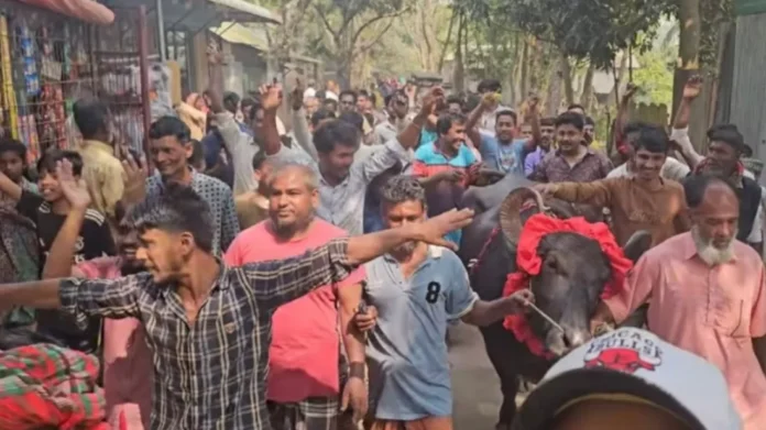 নির্বাচনের ফলাফল ঘোষণার পর শুক্রবার (১৩ ফেব্রুয়ারি) স্থানীয়দের নিয়ে বাদ্যযন্ত্র বাজিয়ে, নাচ-গান করে মহিষটি উত্তর নাকশী এলাকায় নিয়ে আসেন আব্দুর মান্নান।