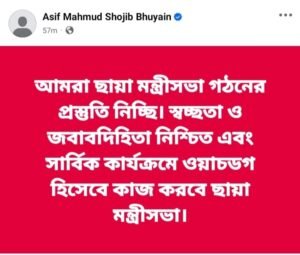 আসিফ মাহমুদ তার পোস্টে উল্লেখ করেন, “আমরা ছায়া মন্ত্রিসভা গঠনের প্রস্তুতি নিচ্ছি। স্বচ্ছতা ও জবাবদিহিতা নিশ্চিত এবং সার্বিক কার্যক্রমে ওয়াচডগ হিসেবে কাজ করবে ছায়া মন্ত্রিসভা।” মূলত সংসদীয় গণতন্ত্রে ছায়া মন্ত্রিসভা হলো বিরোধী দলের একটি বিকল্প কাঠামো, যারা সরকারের প্রতিটি মন্ত্রণালয়ের কাজ নিবিড়ভাবে পর্যবেক্ষণ করে এবং বিকল্প নীতি প্রস্তাব করে।