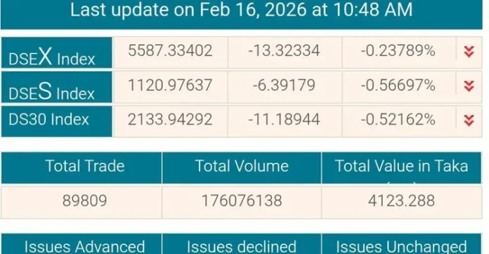 ডিএসইতে প্রথম আধাঘণ্টার লেনদেনে অধিকাংশ প্রতিষ্ঠানের শেয়ার ও ইউনিটের দাম বেড়েছে। প্রধান সূচক প্রায় ৫০ পয়েন্ট বৃদ্ধি পায়। লেনদেনের এই সময়েই মোট লেনদেন ৩০০ কোটি টাকা ছাড়ায়। তবে আধাঘণ্টার পরে কিছু প্রতিষ্ঠানের শেয়ার দাম কমে গেলে সূচকও ঋণাত্মক হয়ে যায়। এ সময় পর্যন্ত ১৩৪টি প্রতিষ্ঠানের দাম বাড়লেও, ২১০টির দাম কমেছে এবং ৪০টির দাম অপরিবর্তিত রয়েছে। ডিএসইর প্রধান সূচক ১৩ পয়েন্ট কমেছে, ডিএসই-৩০ সূচক ১১ পয়েন্ট ও ডিএসই শরিয়াহ্ সূচক ৬ পয়েন্ট কমেছে। মোট লেনদেন হয়েছে ৪১২ কোটি ৩২ লাখ টাকা।