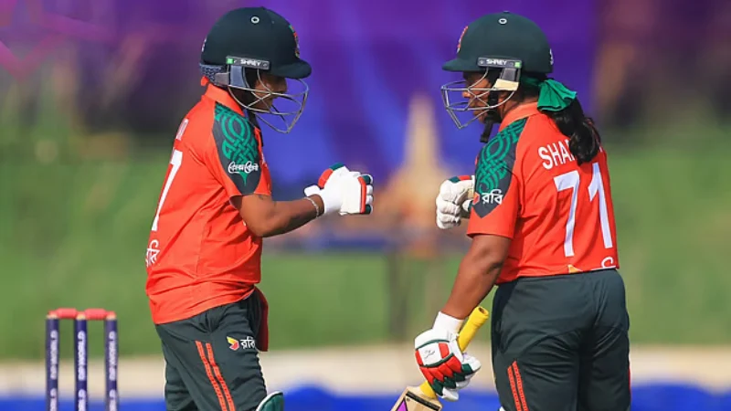 ১০৪ রানের সহজ লক্ষ্য তাড়া করতে নেমে মন্থর উইকেটে ব্যাটিং বিপর্যয়ে পড়েছিল বাংলাদেশ। শেষ ওভারে জয়ের জন্য প্রয়োজন ছিল ১২ রান। স্নায়ুচাপ সামলে ফারজানা ইয়াসমিন শেষ ওভারের দ্বিতীয় ও তৃতীয় বলে চার-ছক্কা হাঁকিয়ে দলের জয় নিশ্চিত করেন। ১ বল বাকি থাকতেই ৩ উইকেটের জয় পায় বাংলাদেশ। ফারজানা অপরাজিত থাকেন ২৩ রানে। এর আগে লতা মন্ডল (৩০) ও শারমিন সুলতানা (২৬) দলকে লড়াইয়ে রাখেন।