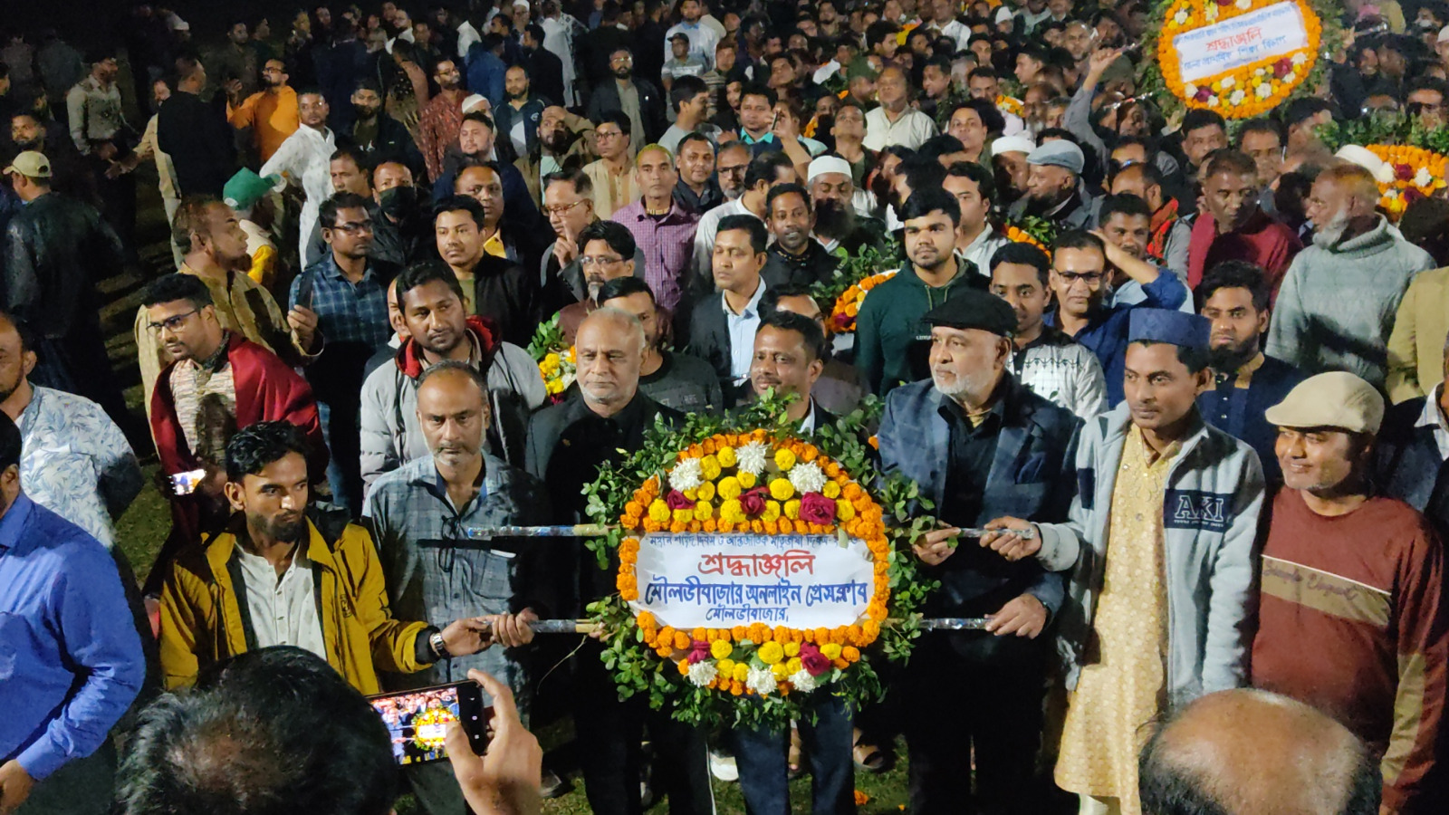 একুশের প্রথম প্রহরে ভাষা শহীদদের ফুল দিয়ে শ্রদ্ধা জানাতে শহীদ মিনারে সর্বস্থরের হাজারো মানুষের ঢল নামে। রাত ১২টা ১ মিনিটে একে একে শহরের সরকারি উচ্চ বিদ্যালয় মাঠ প্রাঙ্গনে স্থাপিত শহীদ মিনারে ফুল দিয়ে শ্রদ্ধা নিবেদন করেন, জেলা প্রশাসক, পুলিশ সুপার, জেলা বিএনপি, মৌলভীবাজার প্রেসক্লাব, ফায়ার সার্ভিস, আনসার ভিডিপি, ছাত্রদল, যুবদল, কৃষকদল, সড়ক ও জনপথ বিভাগ, এলজিইডি, বিদ্যুত উন্নয়ন বোর্ড, পানি উন্নয়ন বোর্ড, গণঃপুর্ত বিভাগ, সদর হাসপাতাল, কৃষি সম্প্রসারণ অধিদপ্তর, যুব উন্নয়ন অধিদপ্তরসহ বিভিন্ন শিক্ষা প্রতিষ্ঠান, সরকারি বেসরকারি প্রতিষ্ঠান সহ বিভিন্ন রাজনৈতিক, সামাজিক, সাংস্কৃতিক ও পেশাজীবি সংগঠন।