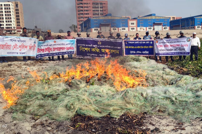 অভিযানে জব্দকৃত জাল জনসমক্ষে আগুনে পুড়িয়ে ধ্বংস করা হয়েছে।