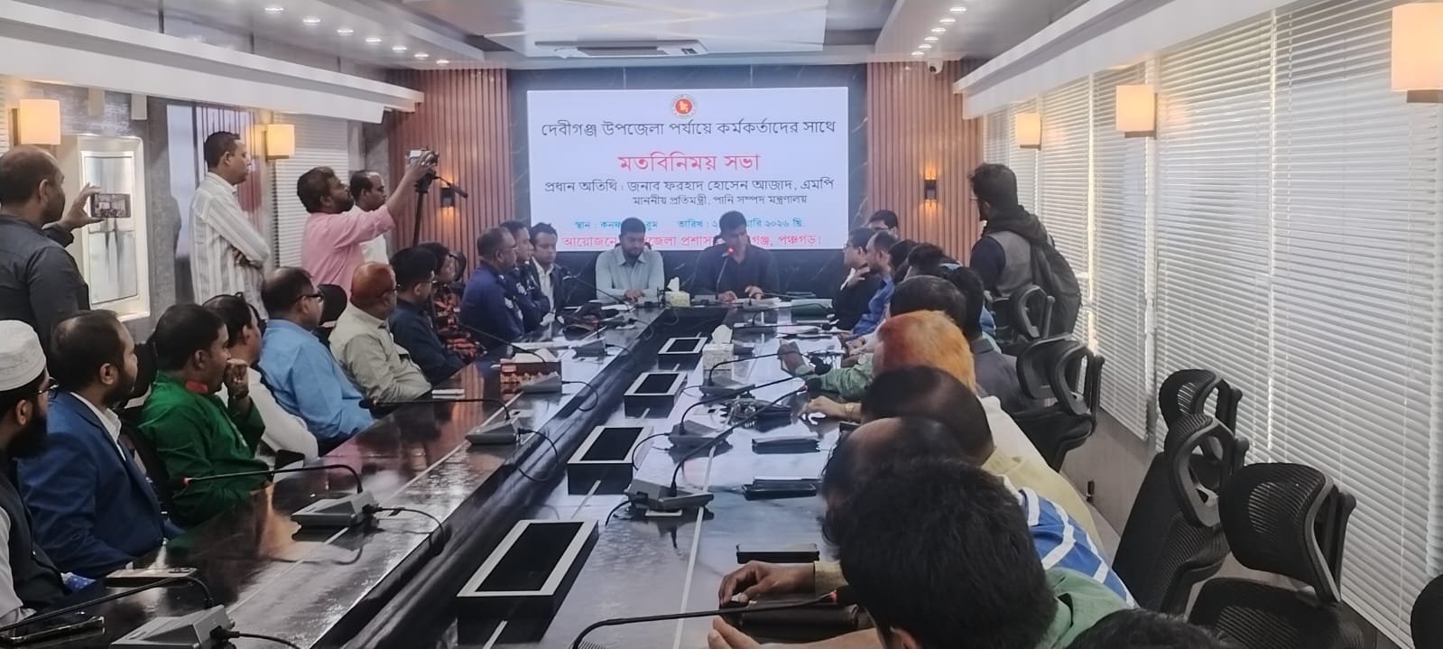 পঞ্চগড়ের দেবীগঞ্জ উপজেলায় উপজেলা প্রশাসনের আয়োজনে গণপ্রজাতন্ত্রী বাংলাদেশ সরকারের পানি সম্পদ মন্ত্রণালয়ের মাননীয় প্রতিমন্ত্রী আলহাজ্ব ফরহাদ হোসেন আজাদ-এর সাথে উপজেলার বিভিন্ন দপ্তরের কর্মকর্তাদের মতবিনিময় সভা অনুষ্ঠিত হয়েছে। শনিবার সকালে দেবীগঞ্জ উপজেলা পরিষদ কনফারেন্স রুমে এ সভা অনুষ্ঠিত হয়।