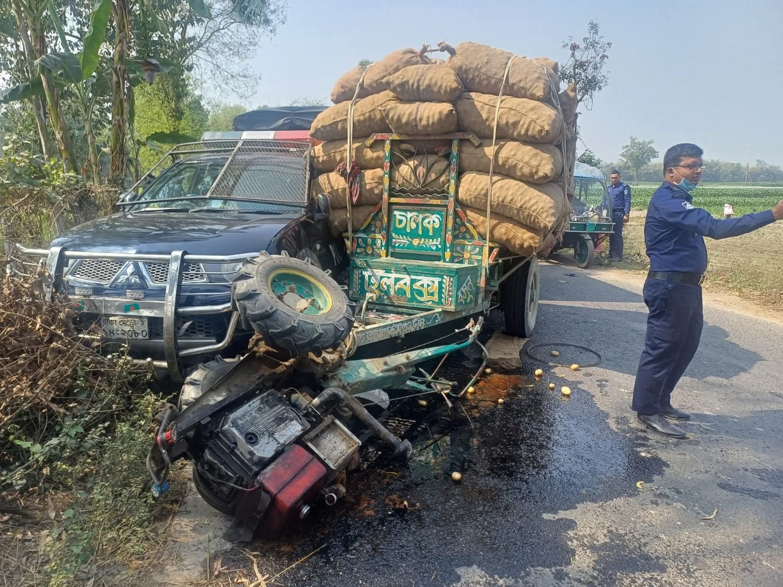ঘটনাটি ঘটে রোববার (২২ ফেব্রুয়ারি) দুপুর ১টার দিকে ঢোরামারা এলাকায়। প্রত্যক্ষদর্শীরা জানান, আলুবোঝাই ভোটভোটি নিয়ন্ত্রণ হারিয়ে বিপরীত দিক থেকে আসা হরিপুর থানা পুলিশের পিকআপ ভ্যানকে ধাক্কা দেয়। এতে পুলিশের পিকআপ ভ্যানটি রাস্তার ধারে পড়ে যায়।