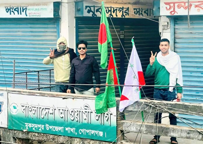 রবিবার সকালে মুকসুদপুর উপজেলা সদরের চৌরঙ্গীতে আওয়ামী লীগ দলীয় কার্যালয়ের সামনে এ পতাকা উড়তে দেখা গেছে।