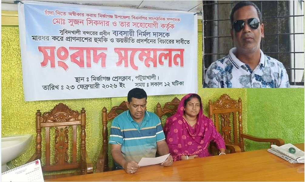 সোমবার (২৩ ফেব্রুয়ারি) দুপুরে ভুক্তভোগী ব্যবসায়ী মির্জাগঞ্জ প্রেসক্লাবে এক সংবাদ সম্মেলনে এ দাবি করেন। সংবাদ সম্মেলনে নির্মল দাসের স্ত্রী উপস্থিত ছিলেন।