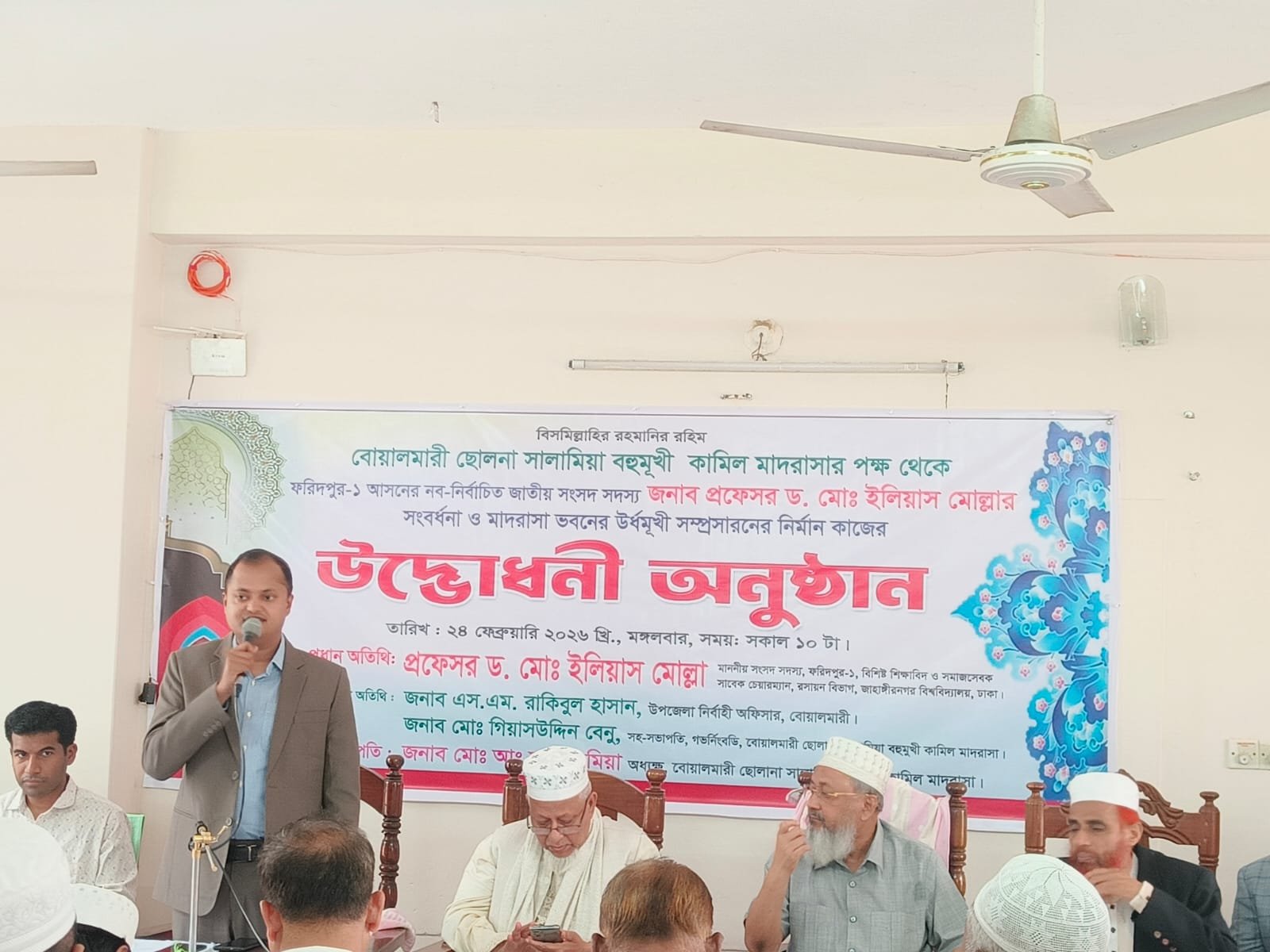 ফরিদপুরের বোয়ালমারীর প্রাণ কেন্দ্রে অবস্থিত সুনামধন্য শিক্ষা প্রতিষ্ঠান ছোলনা সালামিয়া বহুমুখী কামিল মাদ্রাসার ভবন ঊর্ধ্বমুখী সম্প্রসারণ কাজের শুভ উদ্বোধন এবং নব-নির্বাচিত সংসদ সদস্যের সংবর্ধনা অনুষ্ঠান অনুষ্ঠিত হয়েছে।